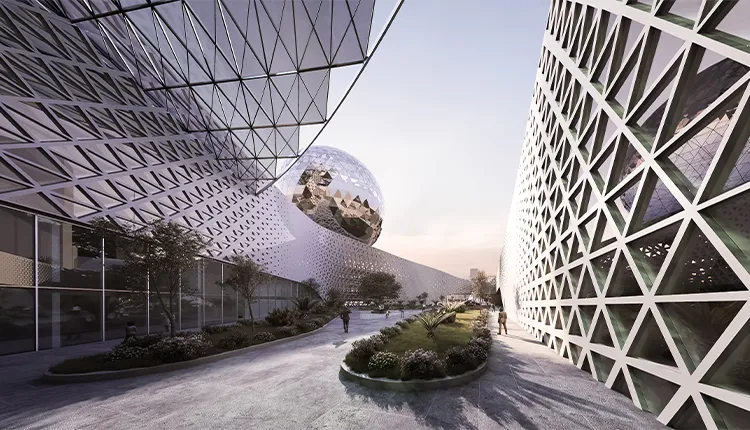 Inspired by Kuwait’s ancient history and marine environment, the Hub’s architectural design boasts a fluid, water-inspired organic, and dynamic structure. Its skyline, similar to a splashing wave, symbolizes the rise of modernity and evolution while the 3D sphere, which is considered as the principal attraction, keeps Kuwait’s traditional identity remarkably visible. Designed like a huge pearl, it symbolizes the country’s ancient economic pillar, balancing its bifold historical and natural origins.